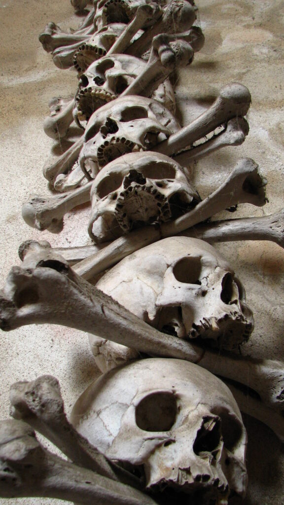 I looked to my sides. Both the left and the right contained large openings covered with wire fencing. I went to my left and stood in front of it. Behind the metal sat a huge, irregular shaped “bells” – probably ten or twelve feet high, twelve to fifteen feet across, and consisting of two levels separated by a horizontal concrete edge. The entire bell – every conceivable area – was covered with bones. Layers upon layers of skulls and other bones. The bell was literally made out of them. There was a semi-circle shaped hole in the center, about three feet wide and a foot and, just about large enough to slide a body into.