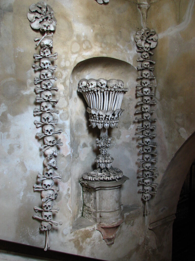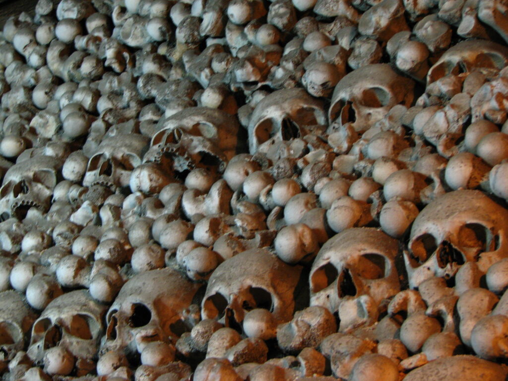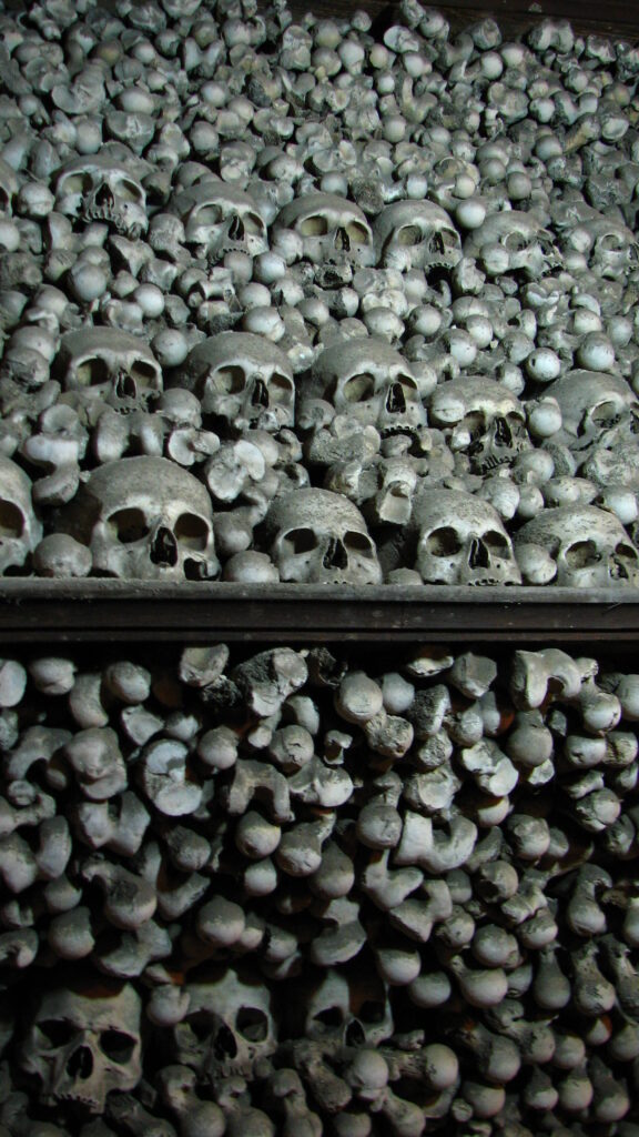 Once they were done ripping me off, I turned to face a stone stairway which lead down into a dark room. In front of me, above the stairs, a wall was decorated. Not with a beautiful mosaic or a painting by a renaissance master – no, it was adorned with a cross shaped from human bones. They were everywhere – outlining the cross, surrounding the arched window above my head… To either side of the stair case sat a vase – but not ordinary vases – they were tall and intricate – as ornate as those typically seen shaped from gold or silver. But these had been shaped from human tibias and femurs. Scapulas and pelvic bones. The tops were capped with a lid of skulls.