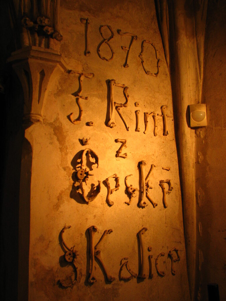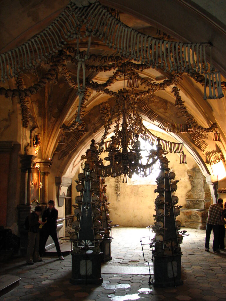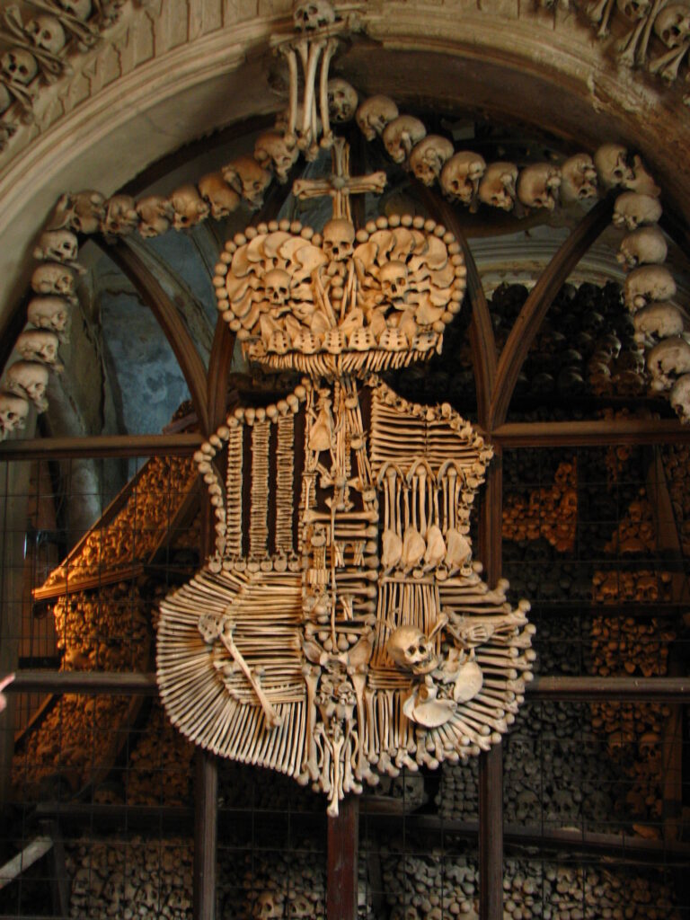 First of all, it’s not actually an entire church made out of bones – I thought that too. Apparently in the late 13th century, the abbot of Sedlec returned from Jerusalem with a bit of dirt from Golgotha, which he spread over the grounds of the cemetery. Everyone who heard this wanted to be buried there, and overpopulation quickly became an issue. When the bubonic plague hit, there was simply no more room for the dead. The All Saints Ossuary was created in the basement of the church in 1511. Eventually (and I can’t make this up), a half-blind monk collected the bones of more than 30,000 people and stacked them up in huge piles. Eventually, the Schwarzenbergs a rich local family, commissioned an artist named Rint to compose the bones into artwork inside the ossuary. Apparently over 40,000 people’s bones now “adorn” the ossuary.