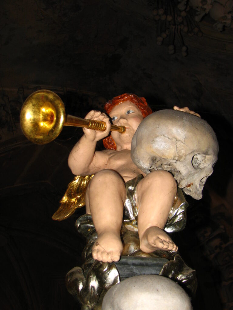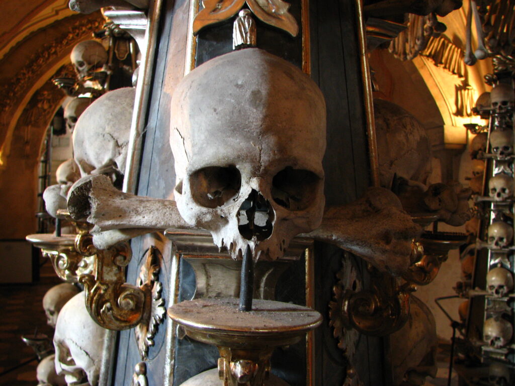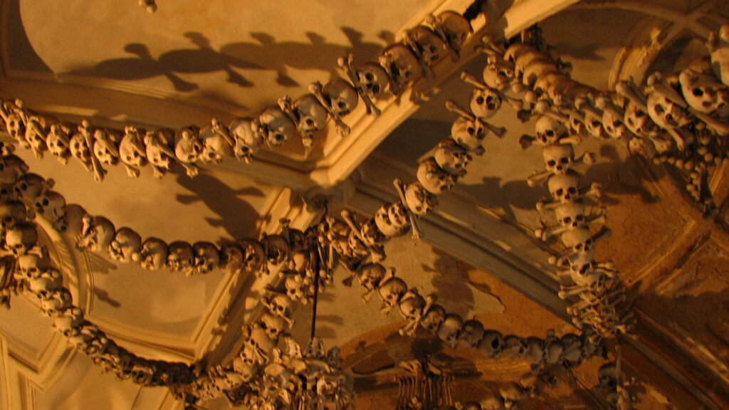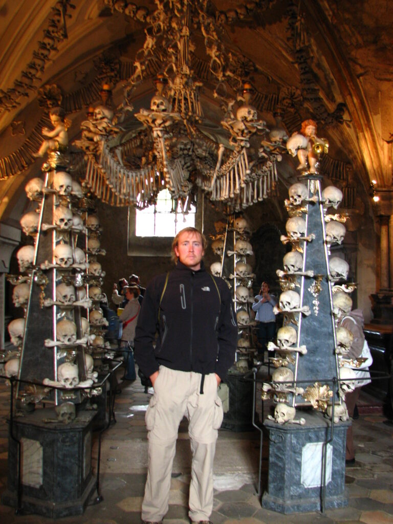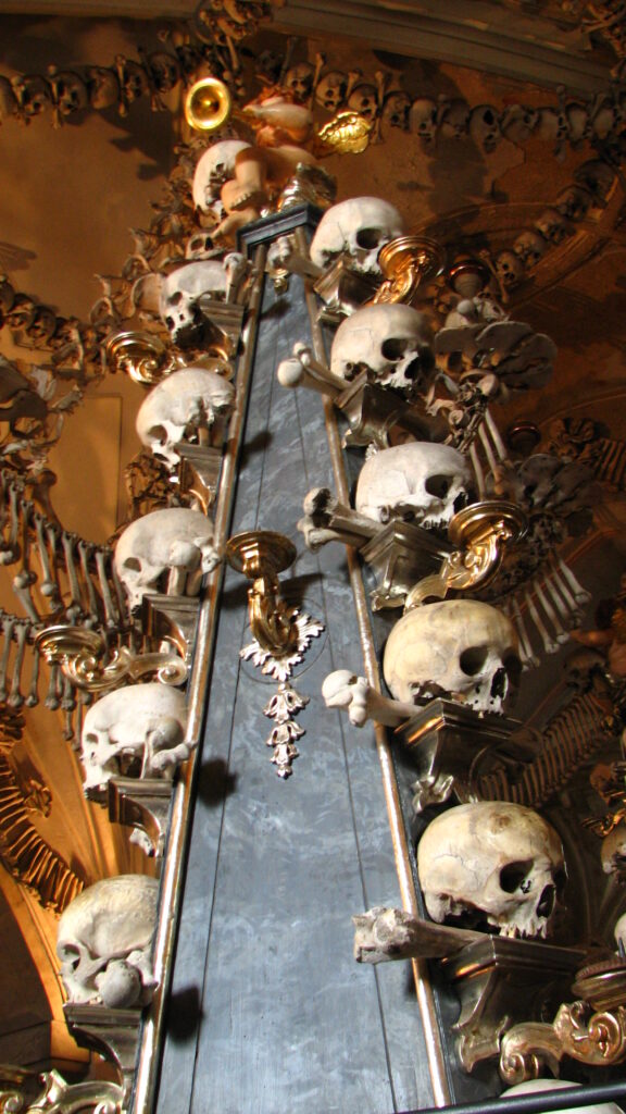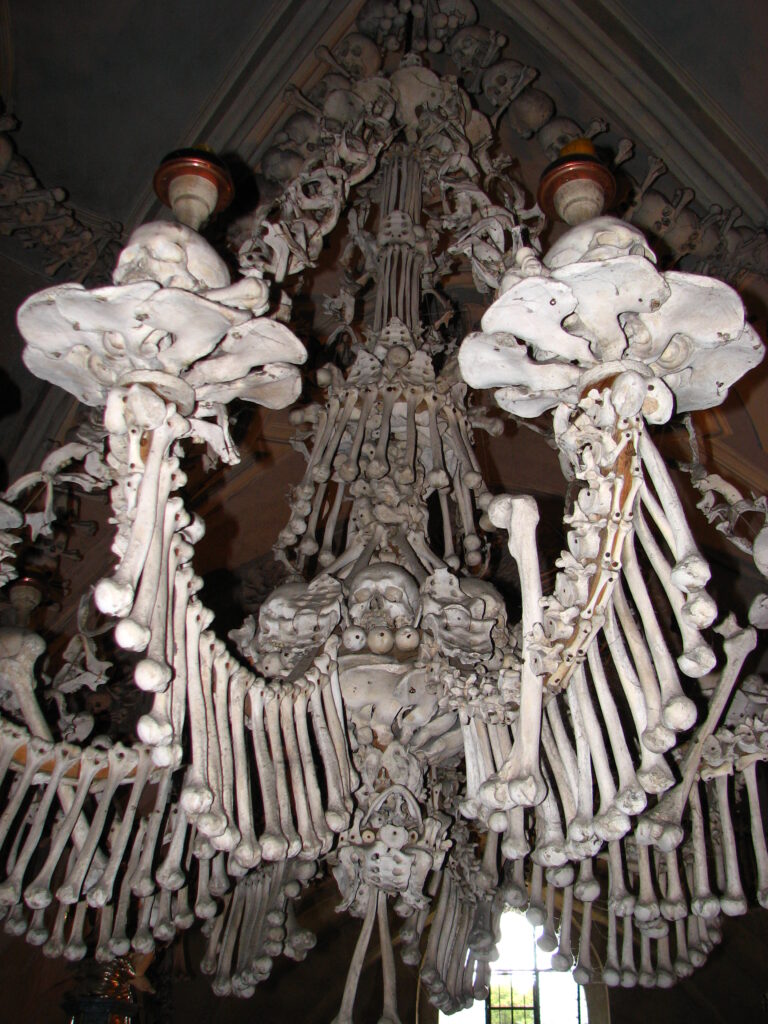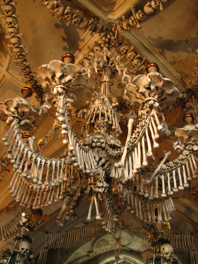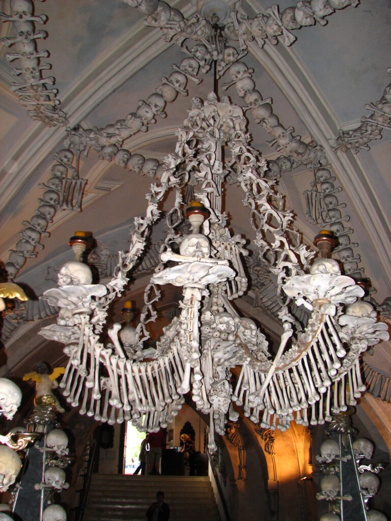 Hanging low from the middle and surrounded by four tall pillars was the church’s defining item – The Chandelier. I’d read about this in the guide book. The chandelier apparently contains at least one of every bone in the human body. It was immense – eight tentacle-like arms curling out and up from the center – each holding a candle in bones arranged like a large flower. Femurs hung down from the arms like wind chimes, each swaying just slightly. The skulls in the center seemed to be staring at me.