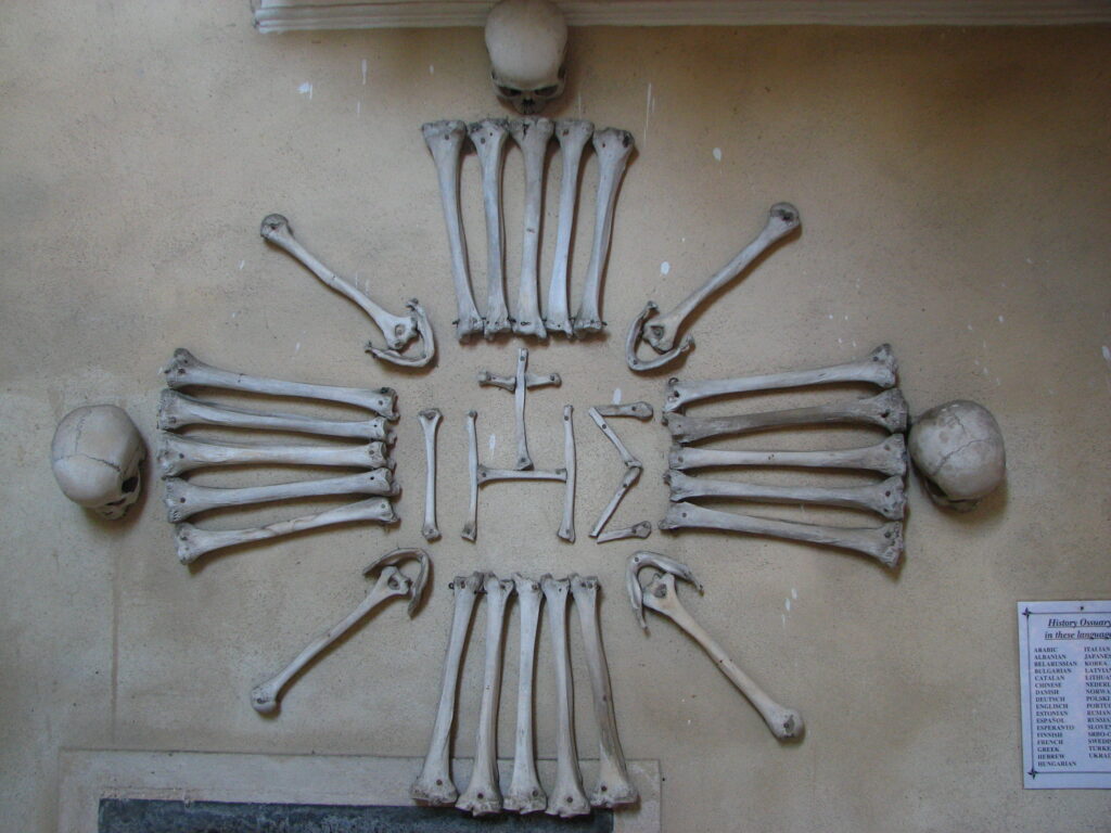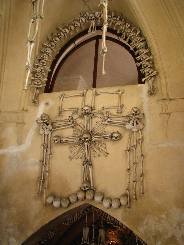 While on the train to Prague, I got a chance to read my guide book. It had a small section on day trips, and recommended a visit to a small town called Kutna Hora. The town itself didn’t sound overly remarkable – an impressive church called “St. Barnabas” sat high on a hill above the city, but outside of it and the requisite fountain and city square, it would fall off of most people’s radar. Though at one point it was a hub of silver mining, today its claim to fame is actually in one of its suburbs, and something most of the locals aren’t all that proud of – The Bone Church.