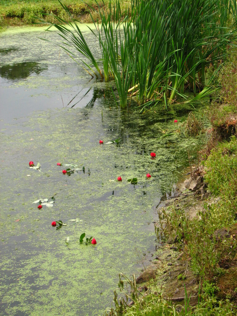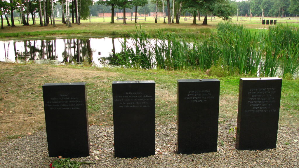 I slowly passed a large brick building where working prisoners were occasionally de-loused. I continued on, passing some large in-ground sewage tanks bordered by a couple of large brick structures. I walked past another, smaller crematoria which had also been destroyed. I came to the back corner of the camp, and turned to my right, heading in the direction of the gate. I walked a few hundred feet until I found what I was looking for. A small grove of trees surrounded a small, kidney-shaped pond. The water was a mirror, save the interruption of a few broken tree stumps, a patch of brilliant green reeds and twelve beautiful red roses floating near the shore. In front of it stood four black granite blocks with these words written in English and Hebrew: