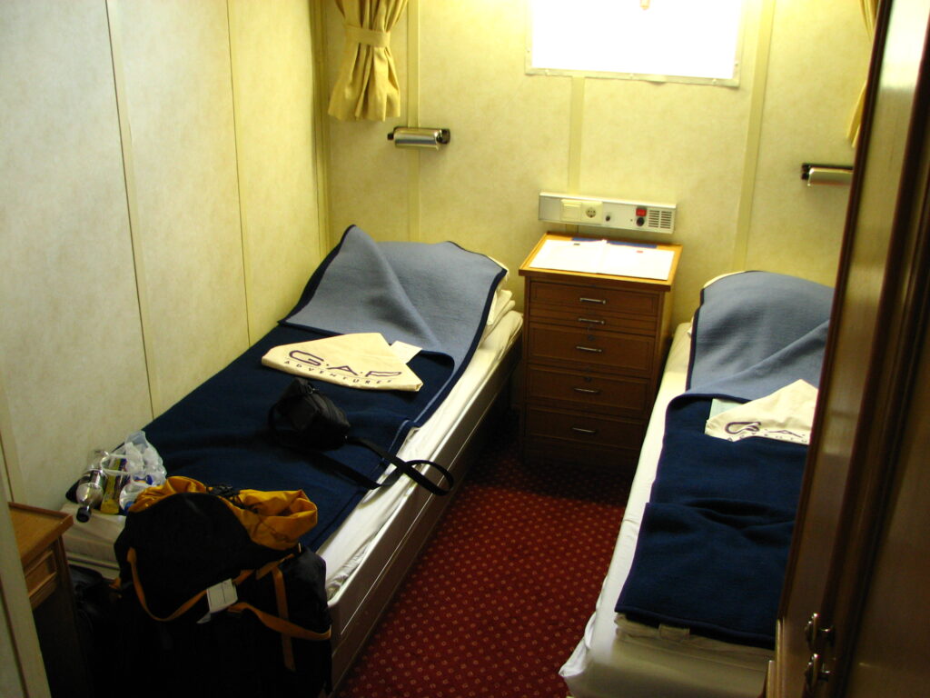 One of the hotel staff (and yes, I agree its cool/weird to call it a “hotel” on the ship) led me down two flights of stairs to the lower deck to find my room. When I originally booked my trip, I’d naturally gone for the lowest possible price. That meant bunking with two other folks in a lower triple cabin. However, when I checked in, I was pleased to find I’d been put in a double cabin. Sweet! I saw the suitcase of my roommate, but no sign of him yet.