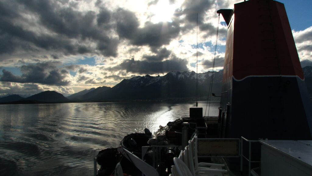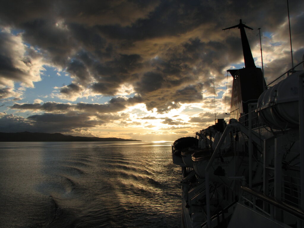 I migrated my way up to the observation deck – the sun was dropping in the east, and the clouds were scattered enough to make the sky a patchwork of color. We were to depart at 6:00, and I wanted to watch us throw off our moorings and push off. About 5:45, I noticed the radar units (or what I assumed to be the radar units – what the hell do I know about naval positioning stuff?) at the top of the tower start to rotate. Soon after, I watched the crew at the bow of the ship throwing the ropes off, and wave a good bye to some folks on the pier. The ship slowly backed out and turned around to point toward the open water of the Beagle Channel. This is it. I’m on my way to Antarctica. Even on the boat, in the waters of the Channel, it still seemed unreal.