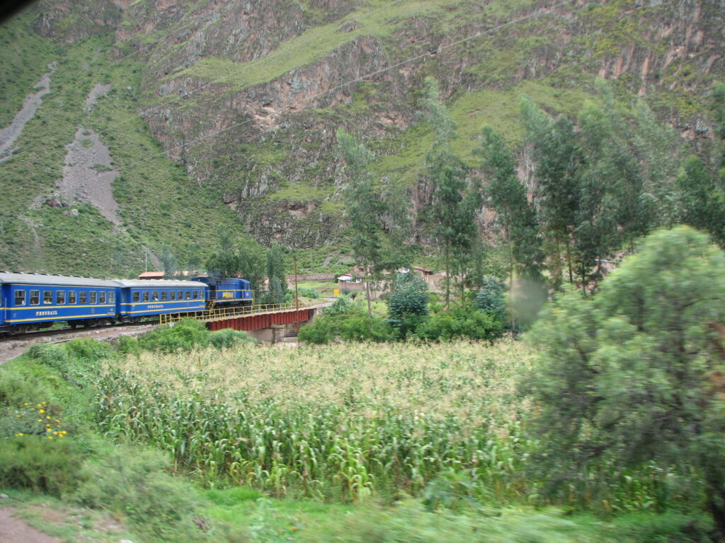 The train was just seven cars long including the engine. It was painted a pleasant shade of blue with “PERURAIL” written in yellow on the sides. We were told to expect the ride to last about 4 hours from start to finish, with a couple stops in between. A long ride to be sure, but the scenery was amazing. The train snaked slowly through the mountains, trudging past small single-family farmland plots of pastureland and crops.