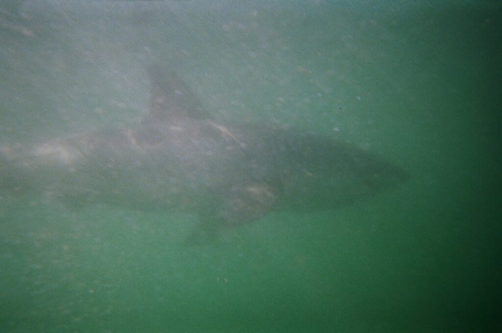So, there I was, sitting in a thin, open metal cage off the side of a boat in the middle of the Atlantic Ocean, waiting for a great white shark to swim up to me. What the hell?  Just as I was contemplating that thought, the crewman above us said “Down!” Holy shit! I dropped down as fast as I could, literally using my hands and feet to climb down the cage. I then realized I probably shouldn’t be putting my fingers outside the cage either – dummy. I found a relatively safe handhold inside the cage, and then took a look out into the luminous green water. The rays of the bright morning sun were trickling down from the surface. Visibility was pretty bad, and you could only see about six to ten feet in any direction. A few small brown fish swam by my face, and then, just coming into view, a dark mass was directly in front of me and getting bigger. It got close enough for me to see three fins and some teeth before it leaned to the left and went off.