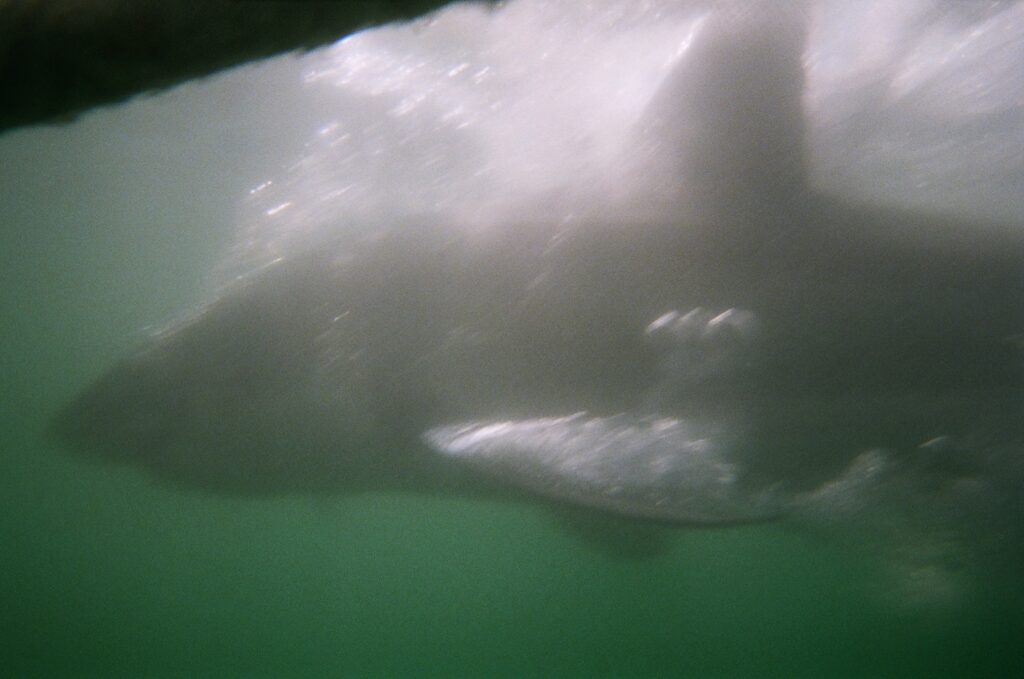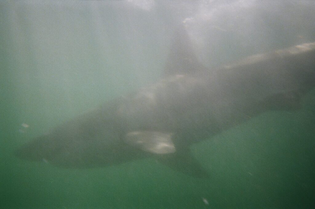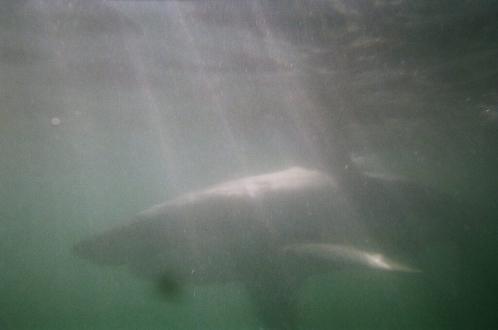 The crew threw the bait over our heads again with a splash. I defogged my goggles and got ready.  “Down”!  I dropped, this time with my camera at the ready, trying to keep all body parts inside the cage.  A big sucker came into view from the left and did a drive by the cage about five feet in front of us. It was absolutely amazing. Beautiful and terrifying at the same time. A pointed, wedge-shaped nose. Black, lifeless eyes. A bright white belly with a dark grey top.  A tall triangular dorsal fin and long, sharp pectoral fins. A tall, grey tail gracefully trailing the angular body.