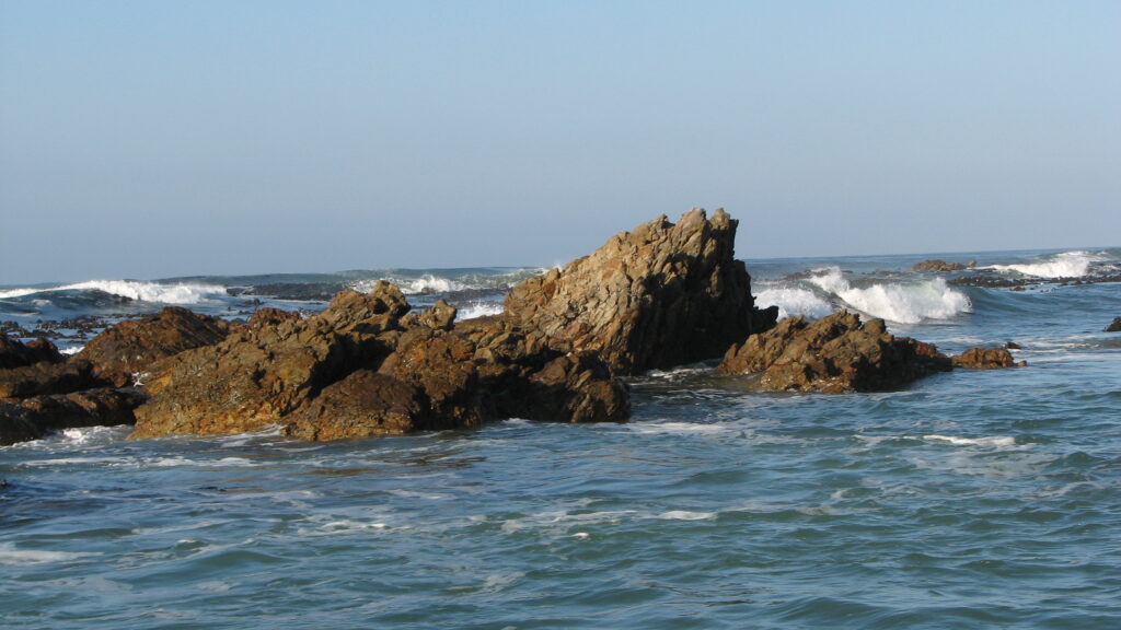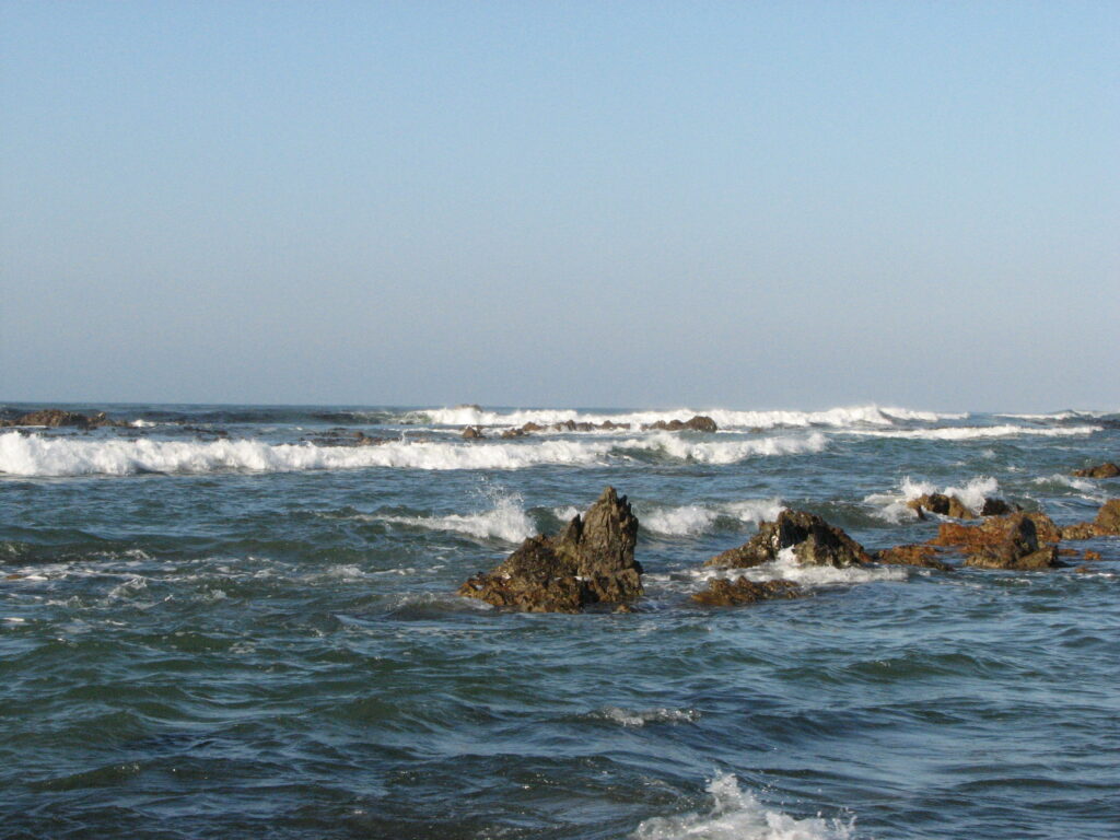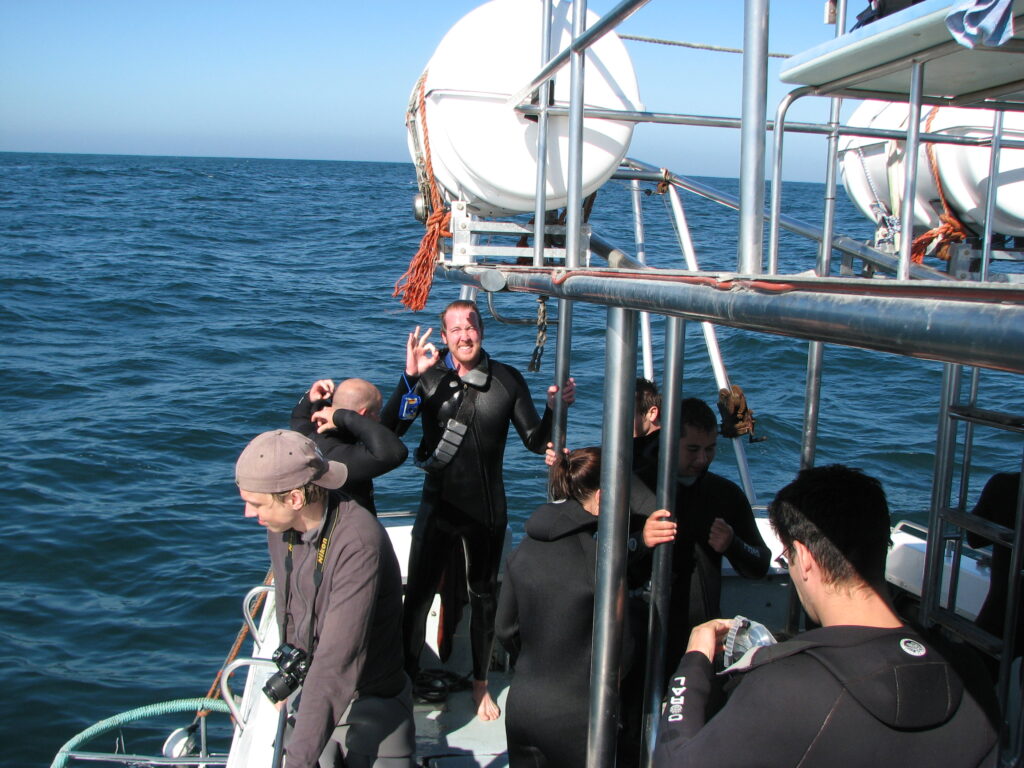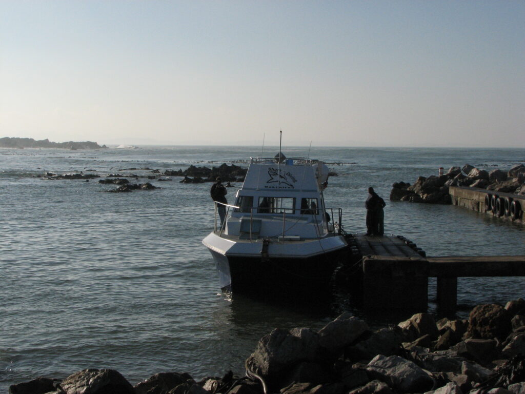 We heard a quick briefing about the company, and some safety stuff (I mean safety is important, but if you’re going shark cage diving, you’ve only got so much tolerance for safety information). We grabbed our gear, allowed the last couple of people purchase an overpriced disposable underwater camera, and then headed out to the boat. It was a beautiful warm day. A few wispy clouds were forming over the small ridges in the land, but the skies over the water were perfectly blue. I could see waves hitting the rocks in front of the beach, creating a sporadic white spray.  There was a little wind coming in off the water, but the air it pushed was pretty warm, and actually fairly soothing.
