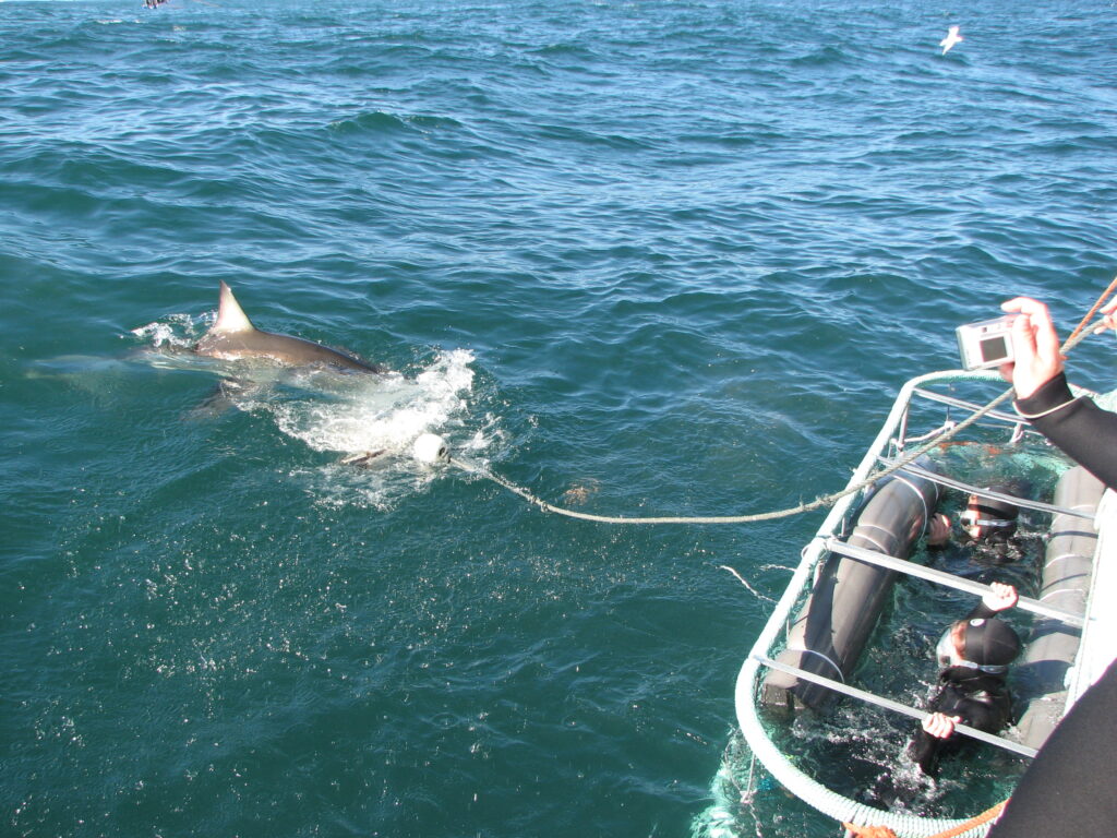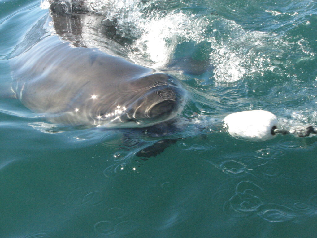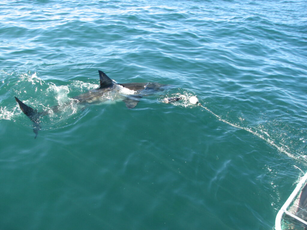One of the crewmen took a long white rope with a large white plastic bobber and a hook, and proceeded to shove a big severed fish head to it. He then proceeded to throw it out over the top of the cage, the end landing about 20 feet in front.  About a minute later, a shark – a big one, glided near the bait. The crewman started to slowly draw the rope in towards the cage. The shark moved quickly, and rose up in the water exposing its dorsal fin and most of its back.