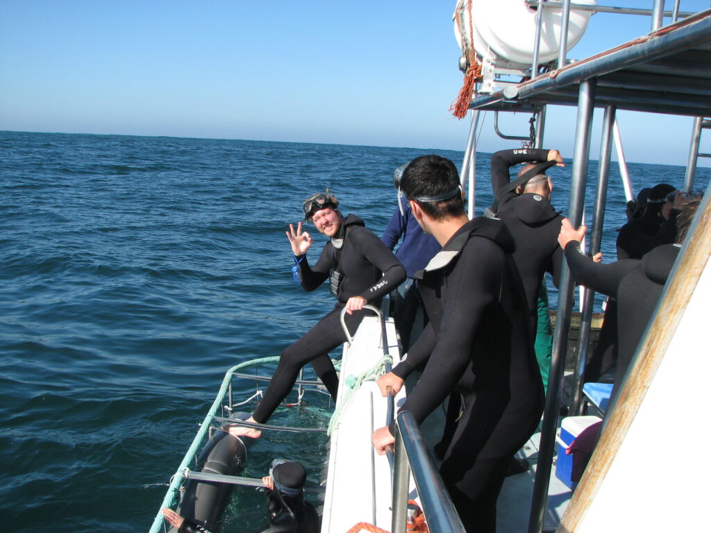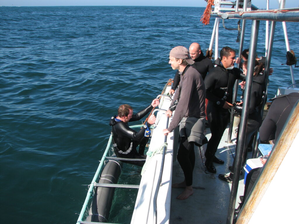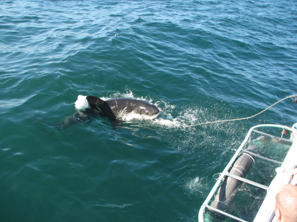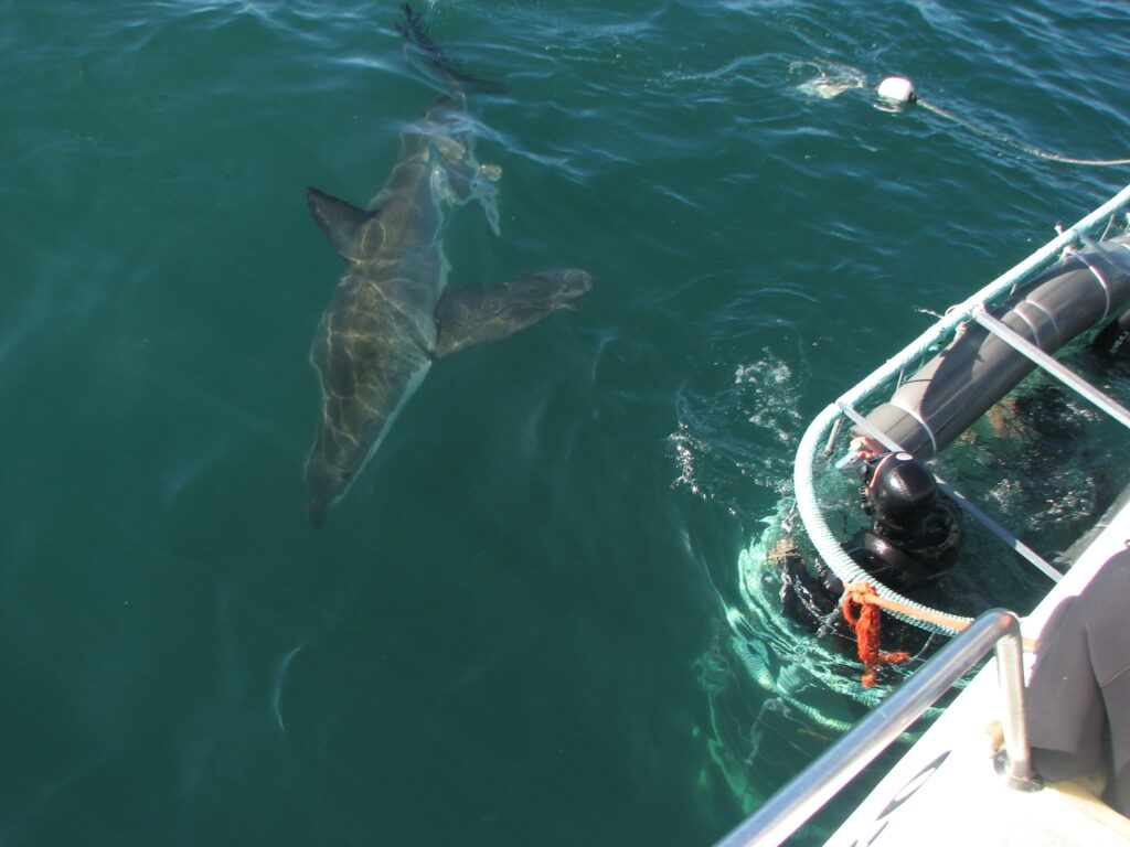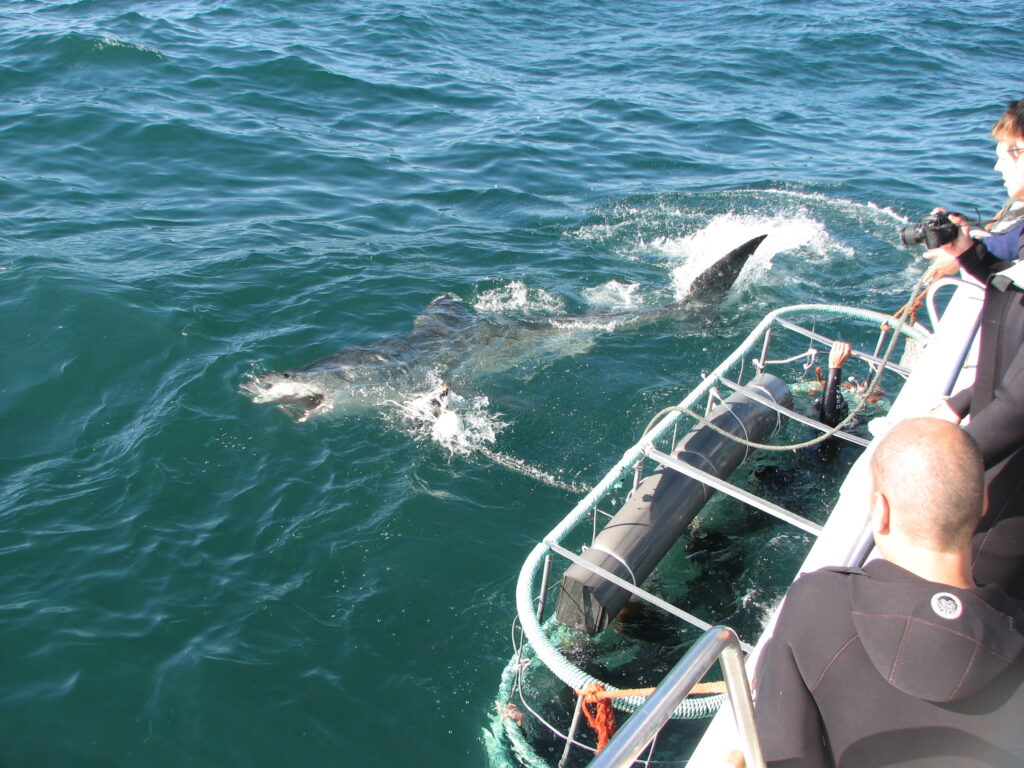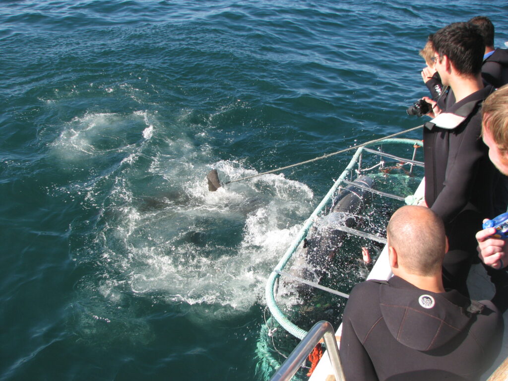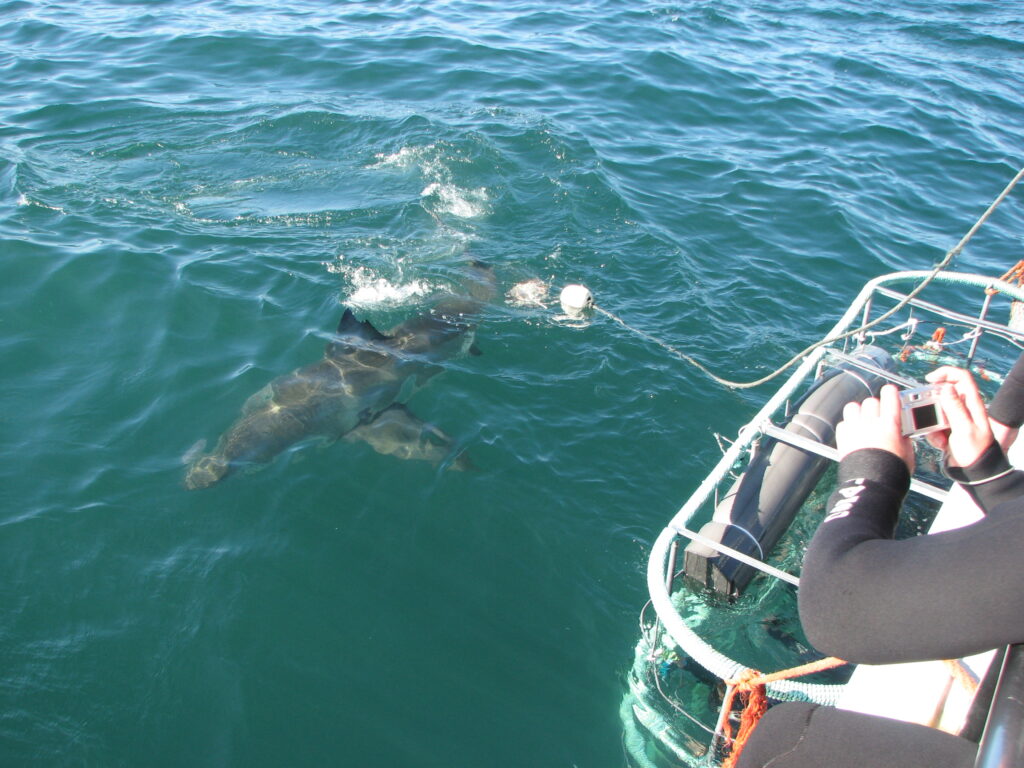 So as a few smaller fish started to converge, and we were zipping up our wetsuits, sea sickness started to wrap it’s tendrils around some of the passengers. A few people were looking really pale, and the smiles on everyone’s face had disappeared. About that time I heard a horrific sound come from a guy behind me, who had his head over the side of the boat opposite the cage. He went through a set of those ridiculous gut-wrenching convulsions that bring tears to your eyes. I figured he was simply baiting the sharks in his own way. Upon hearing this, a couple other people decided to lie down on the benches for a while. Poor folks. Oh, do I know that feeling. I was doing surprisingly well though, as was the girl from the hostel – a bet I certainly wouldn’t have made an hour ago.