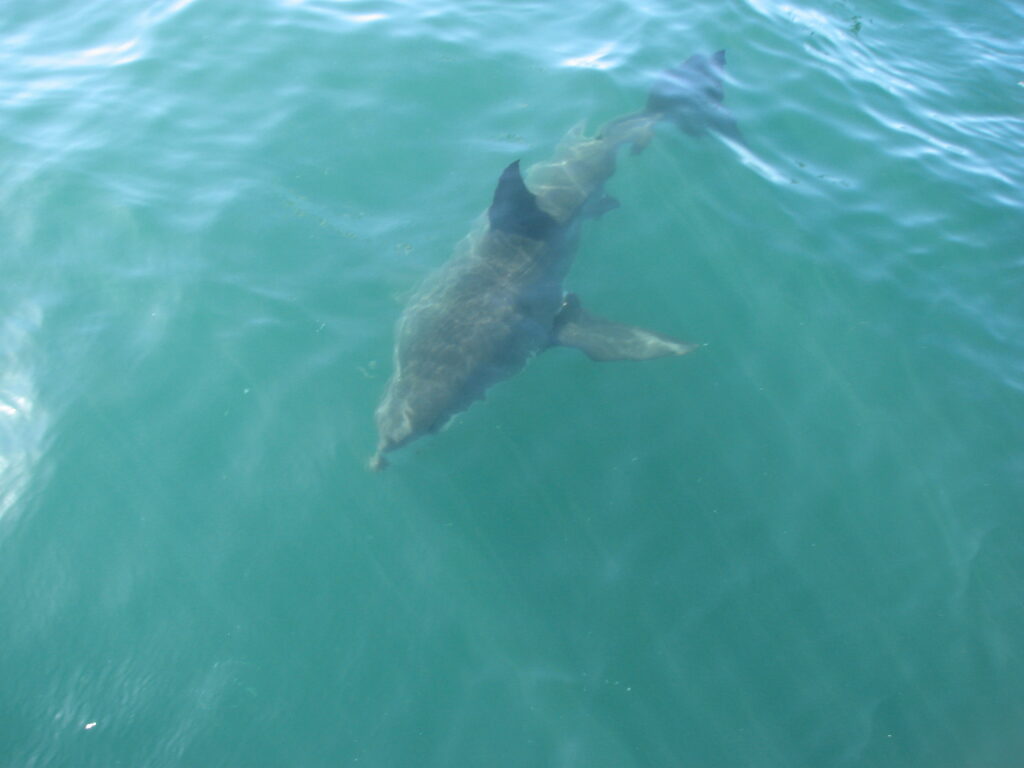 As the last of us were selecting some goggles, I heard Riaan say, “There we go”. I looked back over toward the cage, and saw a great dark mass gliding through the blue-green water toward the cage, and then pass in front of it and out of sight. Holy crap. I thought some of the fish looked pretty big.  This thing was about six or seven feet long. About 30 seconds later, another one came by, this time a little closer to the surface – it was even bigger than the first – probably about ten feet from nose to tail with a concrete-gray top and a white belly (what little of it I could see). I ignorantly asked one of the crew what kind of sharks they were.  He laughed and said, “They’re all whites. They eat everything else.” Ummm… Yeah.