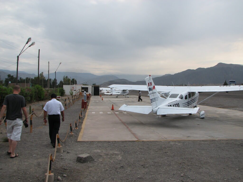 We waited for a few minutes, then watched as a small man in a pressed white shirt and a blue tie enter the room and then lead the entire group watching the video outside toward the airstrip. This somehow made me feel much better. Our group then sat down to an English version of the same documentary. About 10 minutes into the film, another guy in a white shirt and blue tie came and called out three names from a list, corresponding to the German couple and the guy from Cuzco. They got up and headed out the door. The ripples from my gut turned into waves. Shit. No 6-person plane. The visions of the little planes on the brochures came buzzing back into my mind. I focused on watching the video – unsuccessfully trying not to think about it. A group of 6-8 people came into the lobby behind us, and began recording their weights in the registry. About 5 minutes later, a guy with a white shirt and blue tie came to gather myself, Juan and the Dutch dude. Holy crap – here we go.