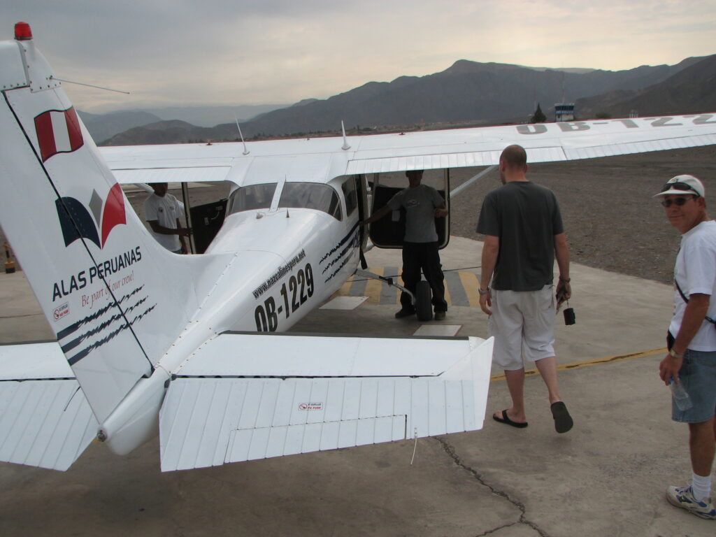 By the grace of God, we arrived in Nazca in the early afternoon. I walked across the street to my hostel, and then set about finding a flight over the lines. The Nazca Lines are spread out over a few square miles of barren desert, with many of the figures being hundreds of feet in length. You simply can’t see them from the ground (hence being undiscovered until relatively recently), so tour operators offer flights over the area in small planes. It’s really the only way to get a good view of all the figures. I read as much as I could about the flights in my guidebook, went over the brochures and asked a few questions of the guy behind the desk. For whatever reason, I had absolutely no qualms about booking the flight, even though I’d never been in an aircraft with a propeller. The smallest plane I’d ever been in still had jet engines and room for 100. I saw the small planes on the brochures, and for whatever reason, it didn’t even phase me. It seemed a standard, logical, almost pedestrian thing to do – like taking a red bus tour of a city – it’s why I came, and everyone does it. I went to the travel agency next-door to my hostel and ended up booking my flight for 8:00 am the next day for just $40.