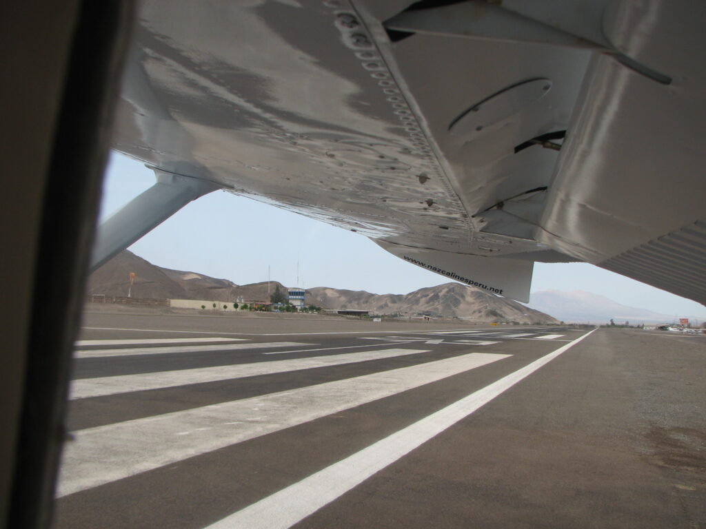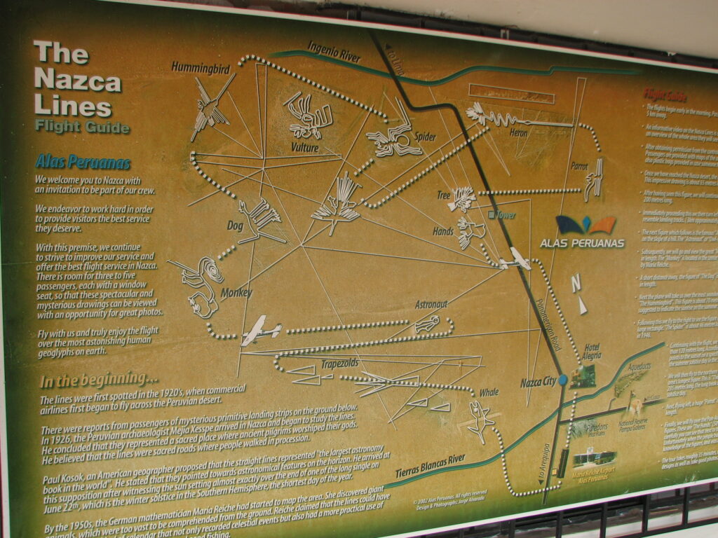 We arrived at the “airport” (i.e. a strip of concrete with worn white lines surrounded by a bunch of dilapidated “hangars” with torn blue plastic waving in the wind from their windows) and went into the main lobby where we saw a group of 6-8 people watching a documentary on the Nazca Lines in Spanish. There was even a map of the route we would be taking.