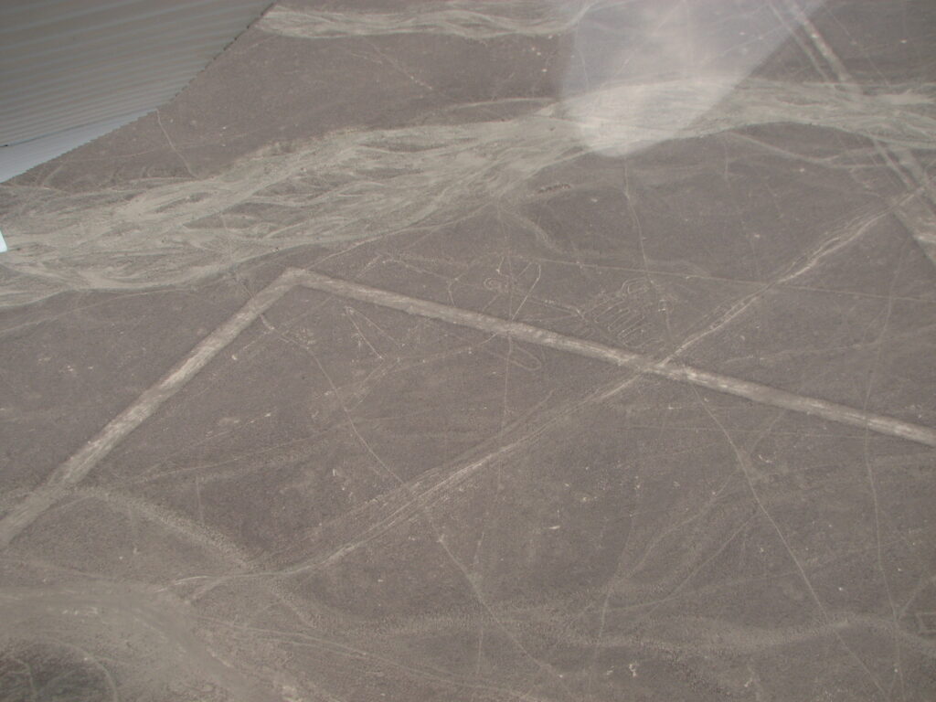 We leveled off, and the pilot yelled something to us. We didn’t have headsets, and between the old rattling engine and the wind screeching in from the sort-of sealed doors and windows, it was hard to hear anything. I looked out my window, straight out under the wing, then down, thinking to myself “this isn’t so bad”. The pilot then yelled something about “trapezoids”, and I looked over the Dutch guy’s shoulder and saw what he was talking about (one “good” thing about the plane was that seeing outside the opposite windows and the windshield was pretty easy, as they were only inches away). Interesting. There were lines all over the desert floor, a lot from flowing rainwater, and obvious tracks of vehicles, but the large geometric shapes were unmistakable.