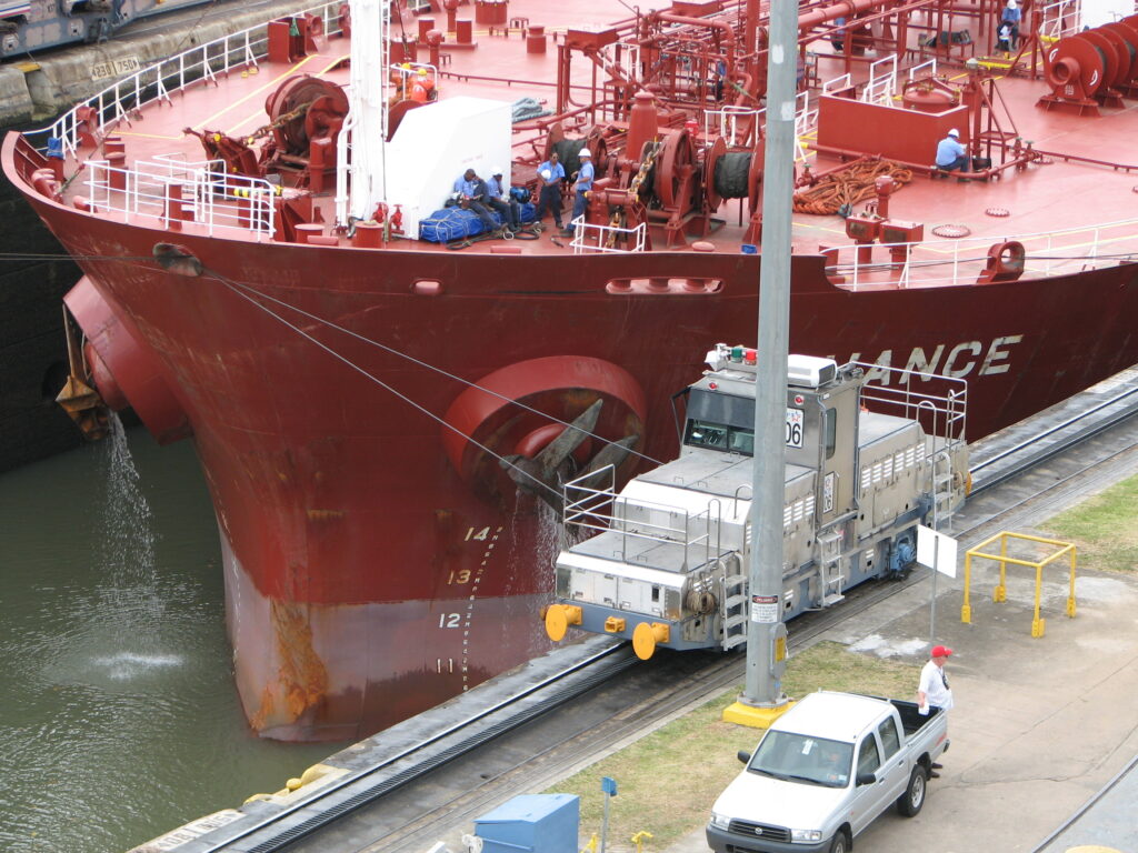 We saw two ships coming in from the same direction – from the Caribbean side heading to the Pacific. The ships come through the lake, and are slowed and nudged into position by tug boats. When in position, guidelines are thrown to the bow and stern of the ships to little track-bound locomotives that run parallel to the locks on either side of the ship. These locomotives then help guide the ship into the first lock, filled with water to the level of the lake the ship just came from.