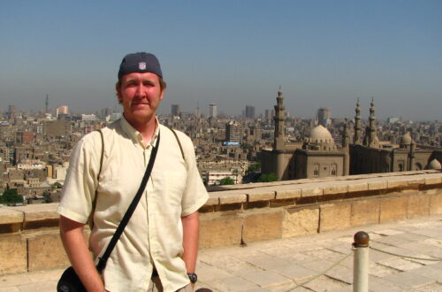 Sure enough, an old guy in full Bedouin costume comes rolling up to us on a camel, offering to take us around the pyramids for a great price. Apparently schooled in persistence, he kept bargaining even when roundly rejected by all three of us. We had to resort to ignoring him until he finally gave up. Then came two guys selling post cards. Again, they were persistent to the point of aggravation. This happened about once every five minutes for the entire time we were around the pyramids. It was unbelievable. It’s hard to believe people can make a living doing this. Later, walking through Cairo, I saw a t-shirt shop with a shirt saying “I’m just here for the pyramids, leave me alone.” I should have bought one.
