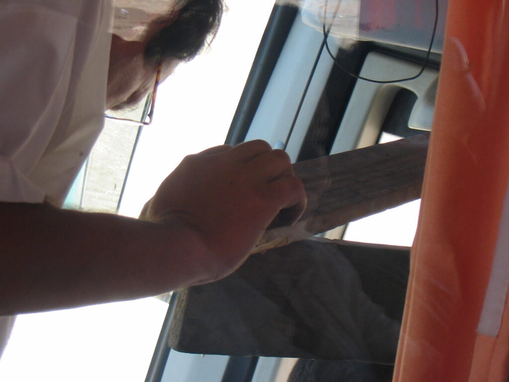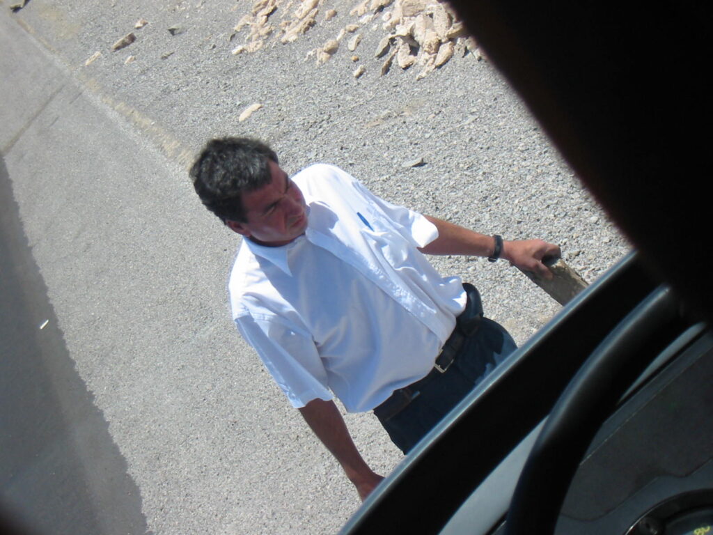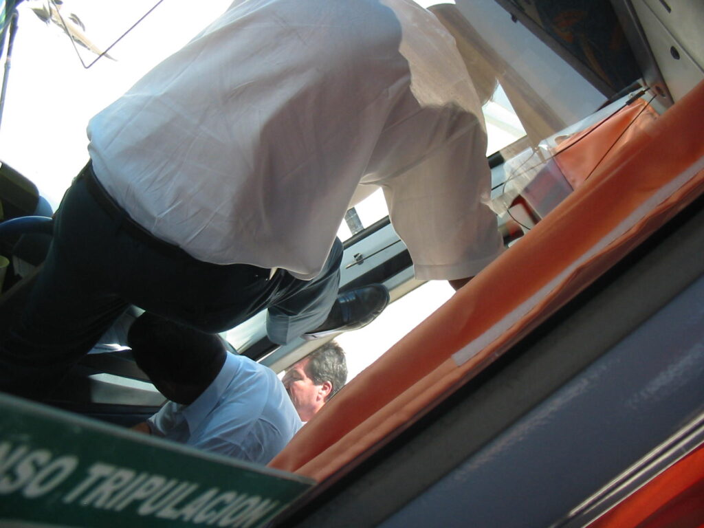 About 30 minutes after the bus had initially stopped, the big crew member came through the cockpit door and broke the news to us that there was a slight problem with the door, and they were trying to fix it.  He then went back through the door and started pushing on it again. He didn’t really explain why we couldn’t just keep on going to the next town and get it fixed there, which seemed to me a better option than using a two by four from a trash heap to pry a hydraulic door open. But then again, I’m not licensed to drive a bus. I was thinking about this as the third crew member braced his back on the dashboard, put his feet on the door and tried to leg-press it open.