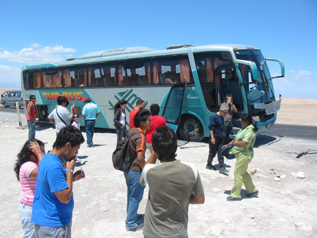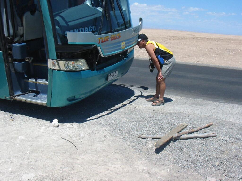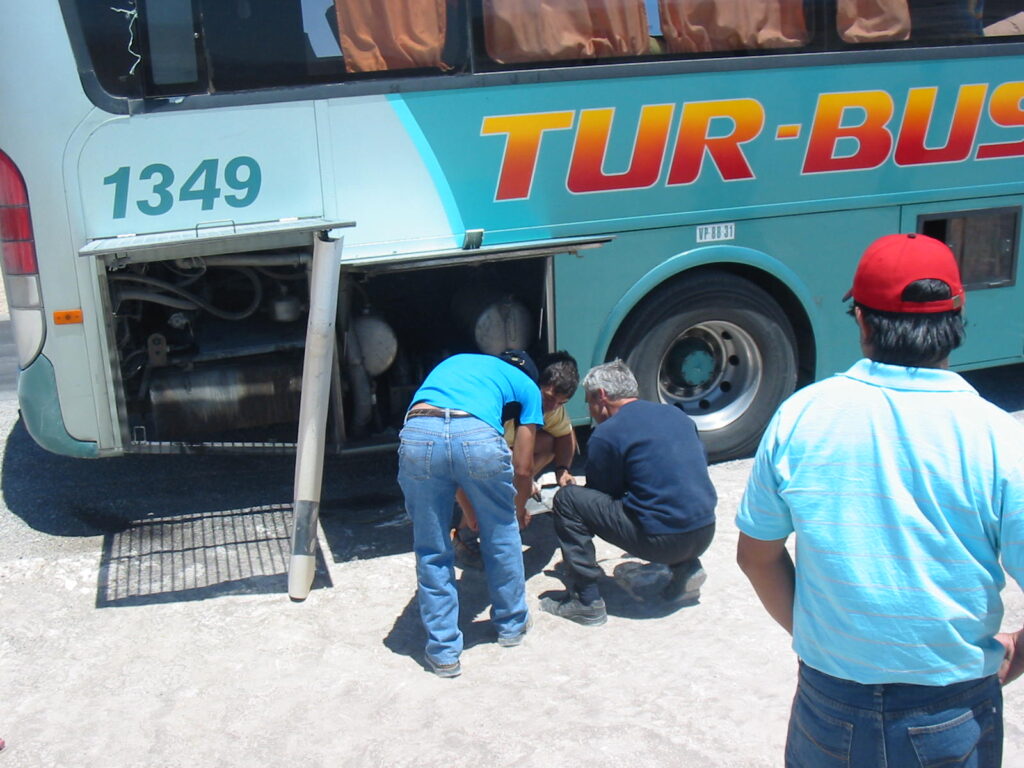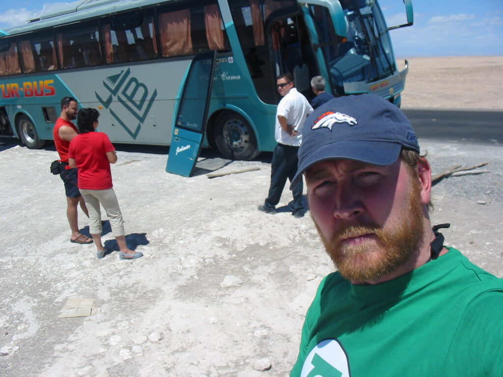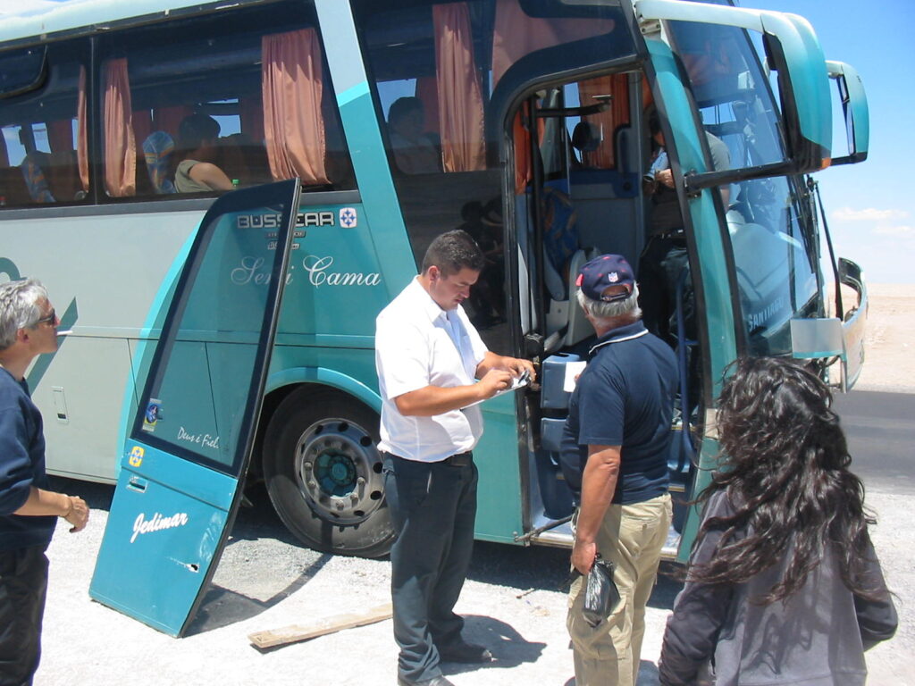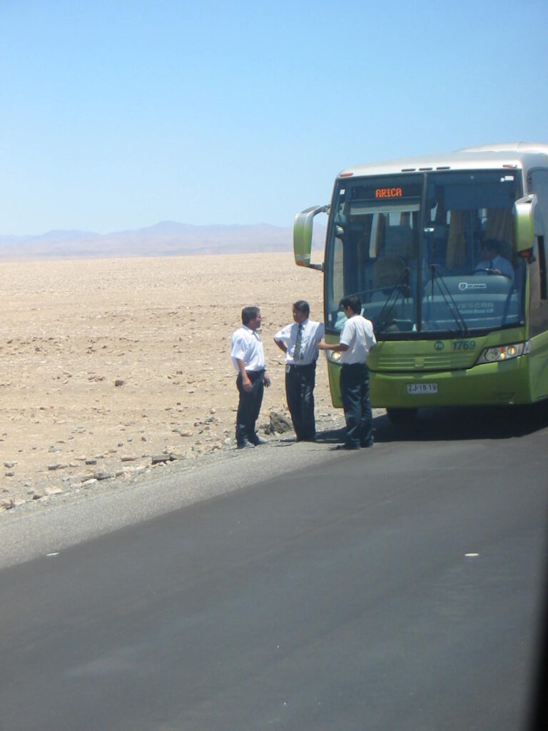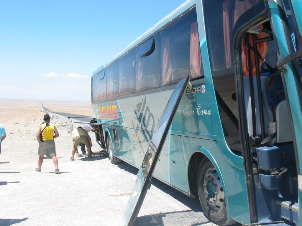 So, there we sat for another hour, sitting in the middle of the Chilean desert watching our inept crew working on the hydraulic arms of the door. They also had a hatch open at the back of the bus, working on what was probably the motor controlling the arms (what the hell do I know about tour bus mechanics?).