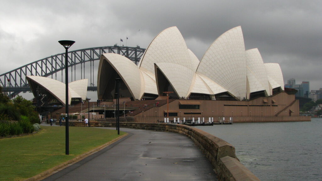 After a nice walk on Saturday morning, I found myself sitting under an outcropping of rocks – almost like a little cave in the white sandstone of Mrs. Macquarie’s Point in the Royal Botanic Gardens of Sydney. I was looking across Farm Cove, soaking up the rainy morning view of the Sydney Opera House; stark white against the dark steel of the massive Sydney Harbor Bridge.