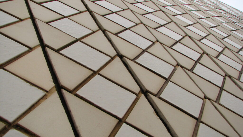 I climbed the steps, and circled the entire structure. I touched the white tiles of the shells, which are actually two shades of off-white, arranged in a dynamic pattern.