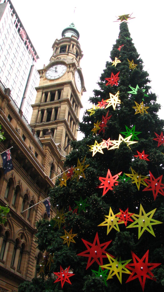 Christmas decorations were up all over the city, something I was desperately looking forward to. Street signs bore colorful “Happy Christmas” banners, while the open plaza in front of Town Hall gave rise to a massive Christmas tree decked with gold and crimson stars.