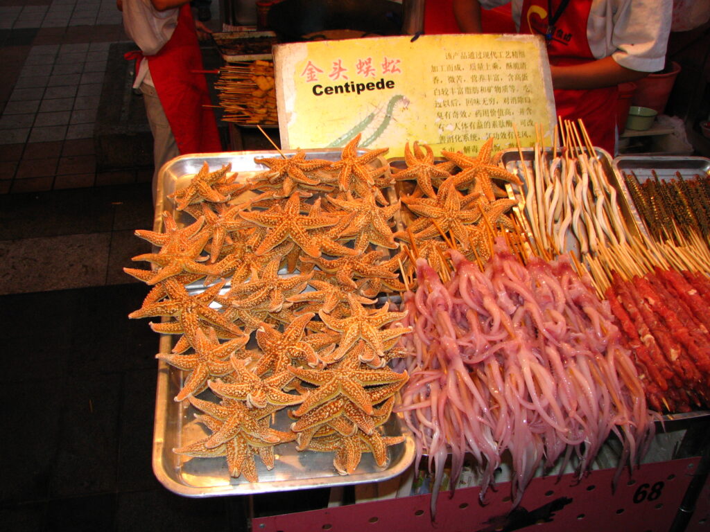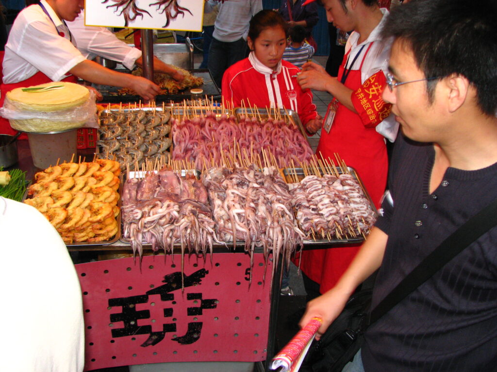 On my last evening in Beijing, Casey and I took a visit to the Beijing Night Market. By now, I’ve been to my share of markets. Tokyo, Buenos Aires, Istanbul, Cairo, Amman… I’ve seen my share of dirty, shady street hawkers yelling at you from shabby little booths, jabbering away at you with the four words of English they know. Loud music, loud people, loud outfits, and even louder merchandise. Barely controlled, chaotic capitalism. No matter where you are or what you see, it’s nothing if not entertaining.