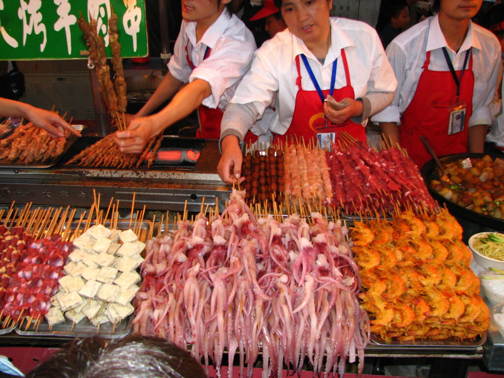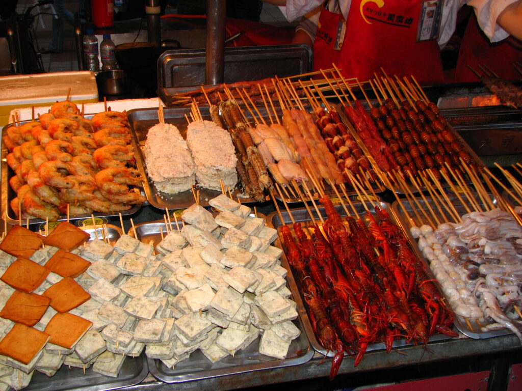 The majority though, were selling skewers of… whatever. Nearly everything you could imagine being skewered was skewered. There had to be at least three or four good sized trees assassinated for this evening’s activities. All shapes, all sizes, all colors. And, to top it off, most of whatever it was, was raw. Chicken, beef, fish, tofu, squid, crawfish, big shrimp, some things covered in breading, some things white-ed out with flour. I had no idea on a lot of stuff – some of it had eyes. Some legs, others… who knows?