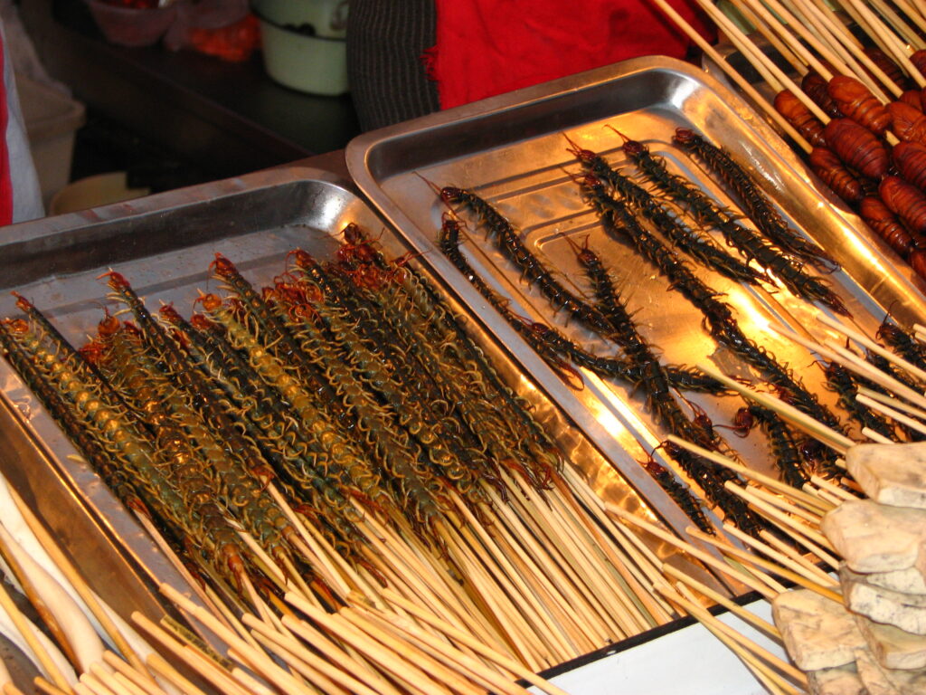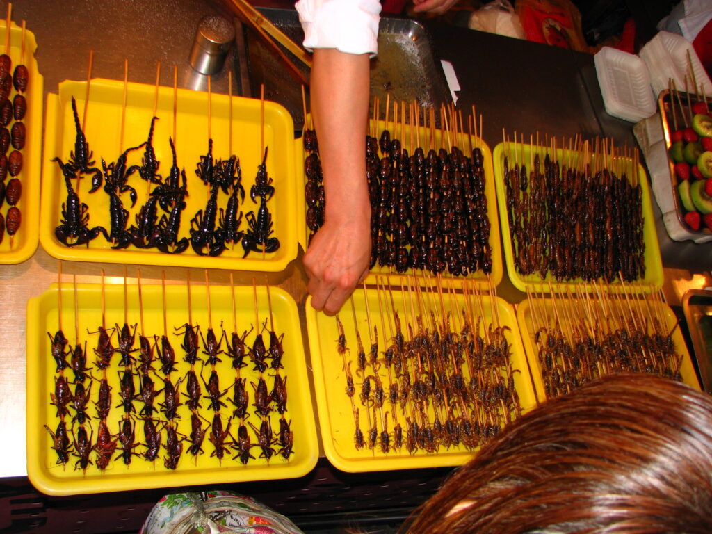 A few minutes later, we made it to the stall I’ll not forget. A whole stand loaded with bugs. Skewers of huge grasshoppers and locusts. Lines of massive beetles. And then, there were scorpions. A couple of plates of smaller ones lined the front of the stall. Five or six little golden brown scorpions per stick – and they were selling fast. Behind them though, was one plate of big frickin huge black ones. The ones you see in movies. They were so big there were only two to a stick. It was disturbing. And no, I didn’t try any. And don’t tell me you would have either.